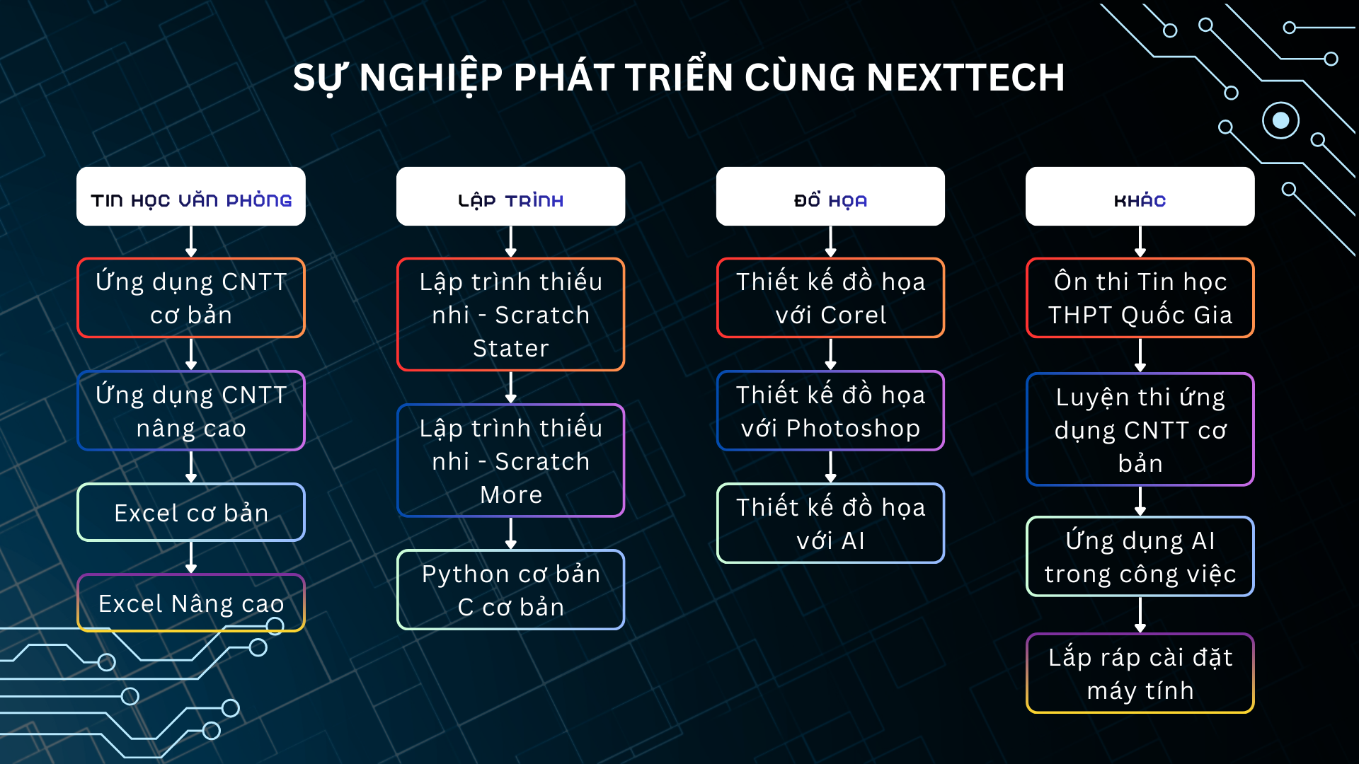 NextTech Academy là trung tâm tin học đào tạo công nghệ trực thuộc hệ sinh thái NextTech – doanh nghiệp tiên phong trong lĩnh vực công nghệ và chuyển đổi số tại Việt Nam. Với sứ mệnh “Trang bị năng lực thực chiến cho thế hệ công dân số”, NextTech Academy tạo ra môi trường đào tạo hiện đại, thực tiễn và gắn liền với nhu cầu doanh nghiệp.